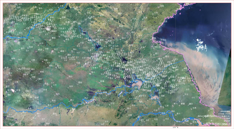MICAPS4.0中的黃淮地區(qū)1小時(shí)降水自動站數(shù)據(jù)和地形疊加圖。高嵩供圖