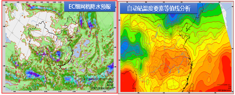 MICAPS4.0中的細(xì)網(wǎng)格降水預(yù)報(bào)圖(左),自動站溫度等值線分析圖(右)。高嵩供圖